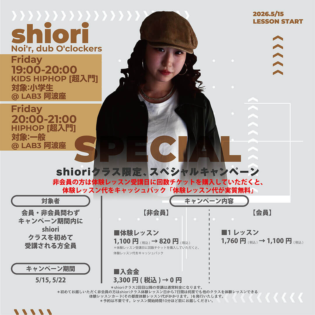 今回は会員・非会員問わずキャンペーン期間内にshiori [Noi’r, dub O’clockers]クラスを初めて受講される方全員、特別価格で受講できます。