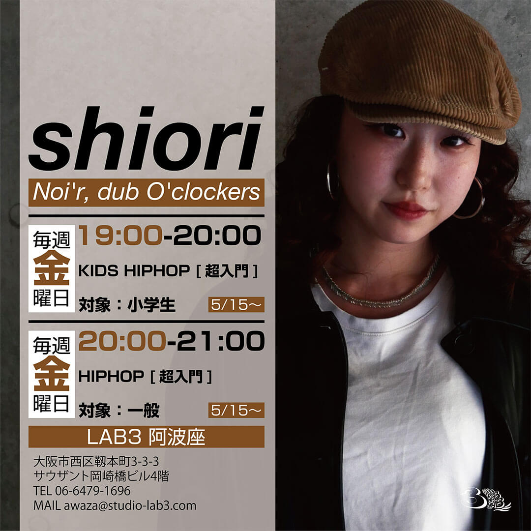 ダンススクール LAB3 大阪 阿波座スタジオにてshiori [Noi’r, dub O’clockers]クラスがスタートします。
