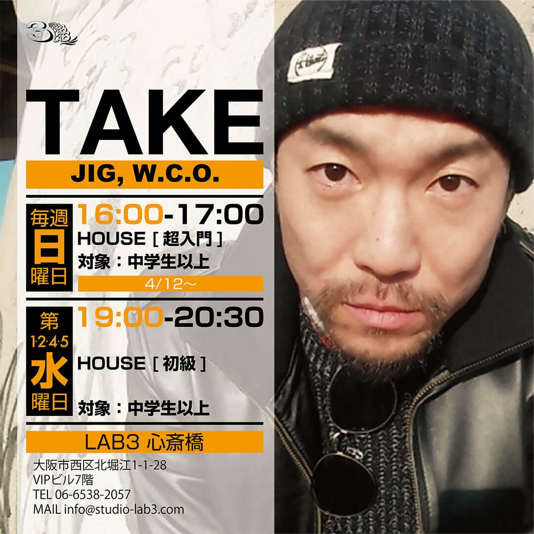 ダンススクール LAB3 大阪 心斎橋スタジオにて大好評開講中のTAKE [JIG, W.C.O.]クラスが増えます。